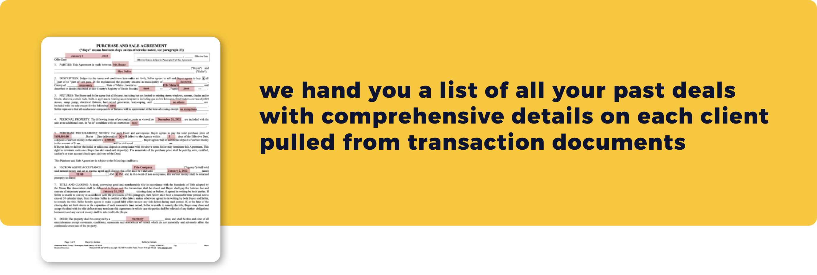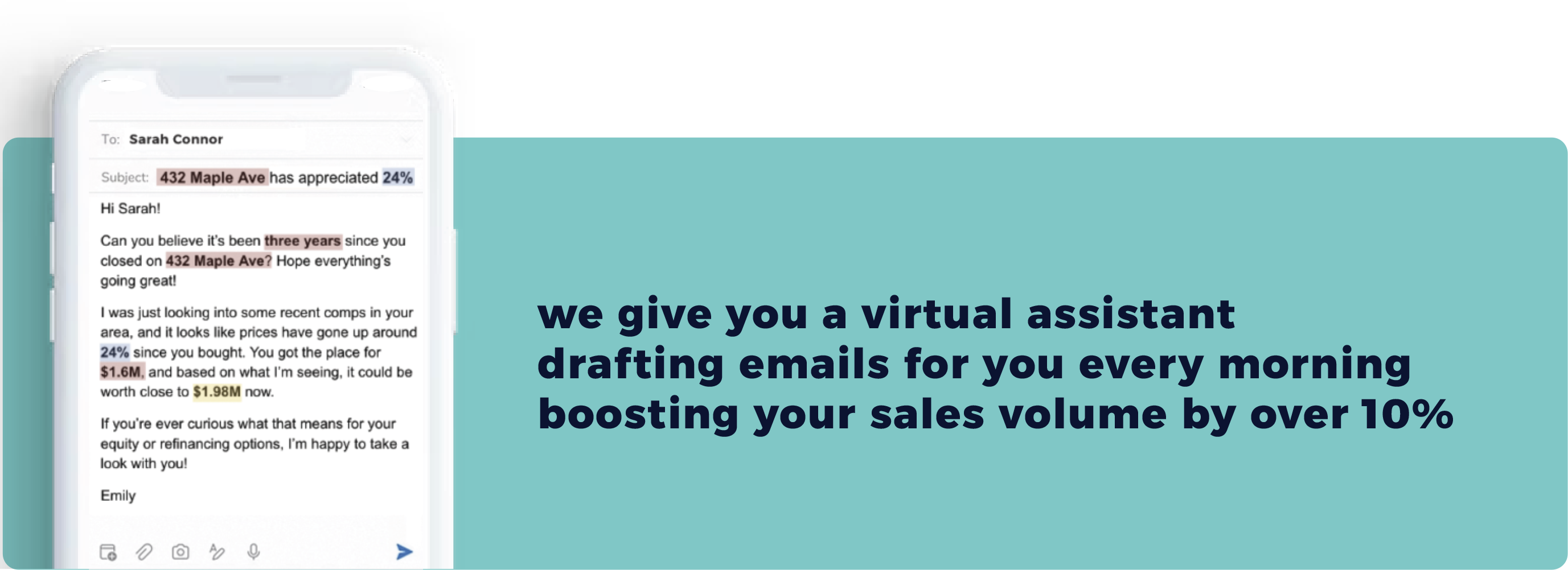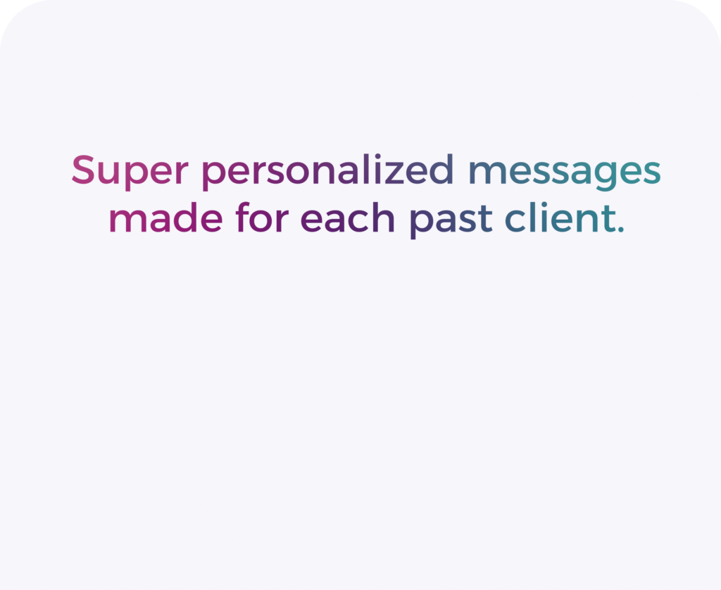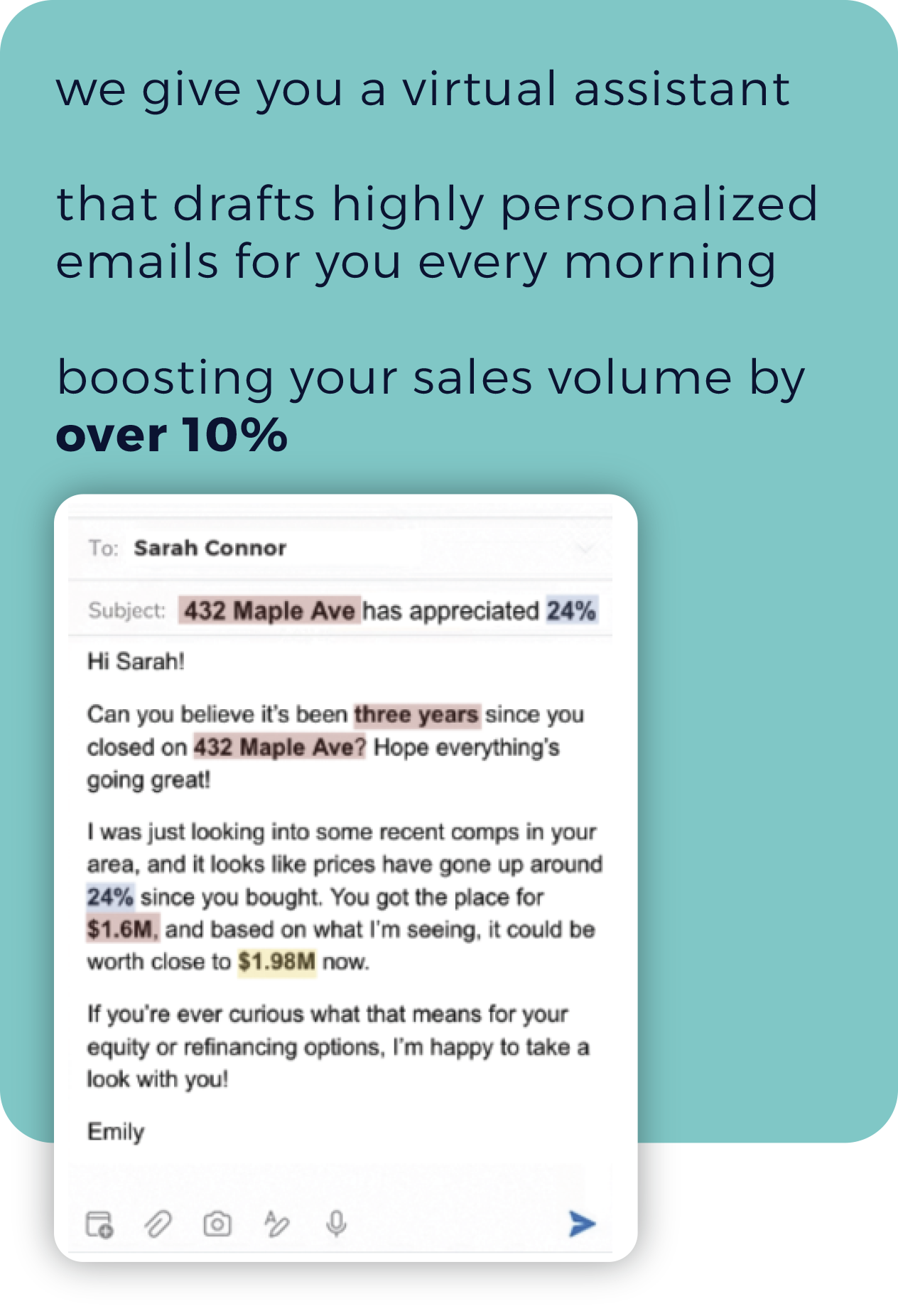 We give each of your agents a personalized assistant that writes thoughtful, one-to-one follow-up messages using data from each transaction—reviving old client lists and significantly boosting referrals. Meaning we can both feed data to your CRM, or give you an out-of-the-box solution if you do not have one.