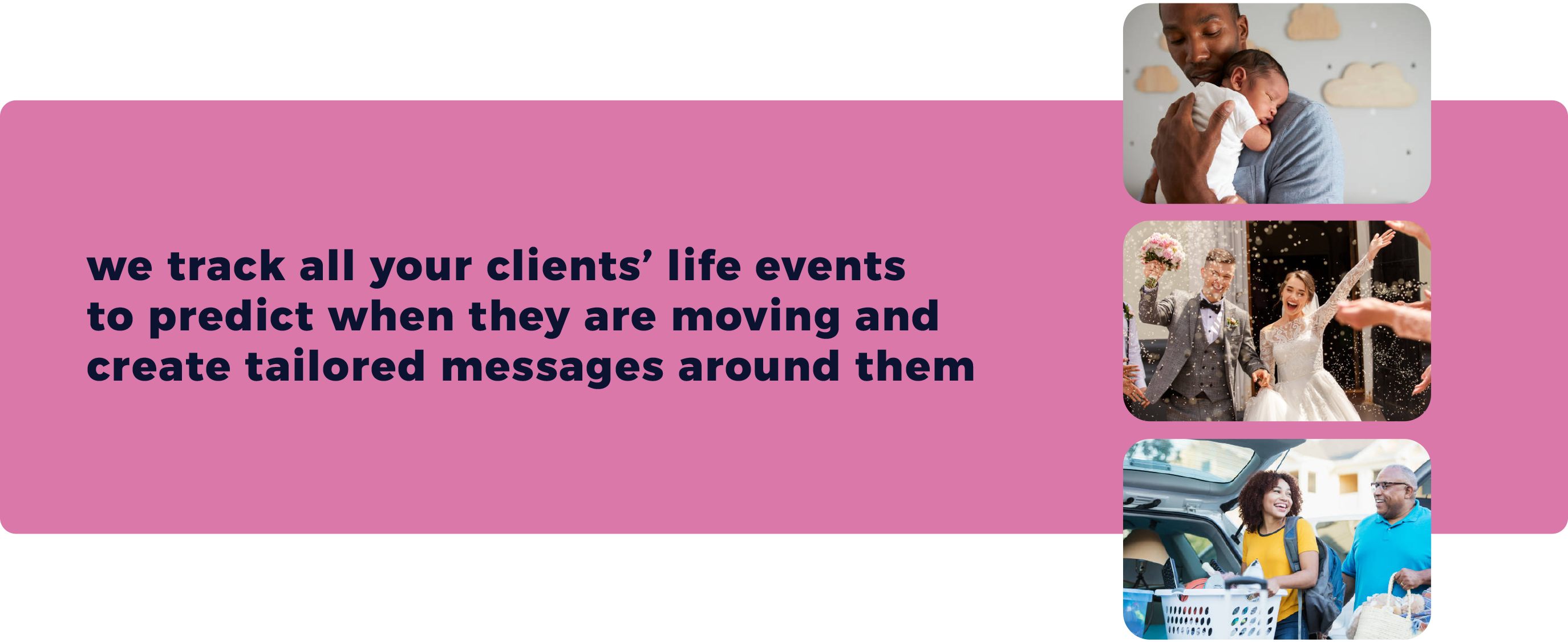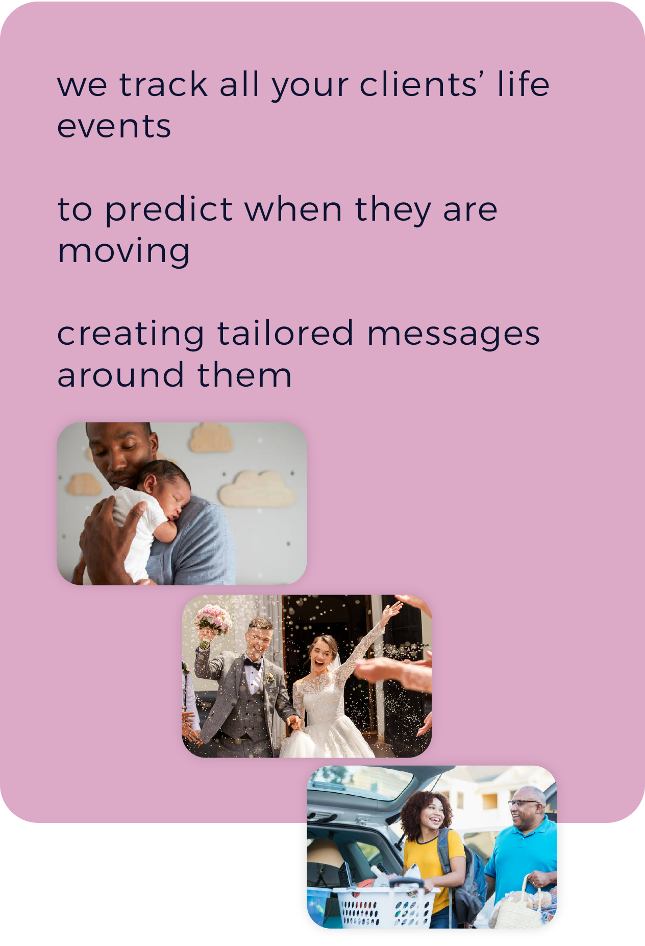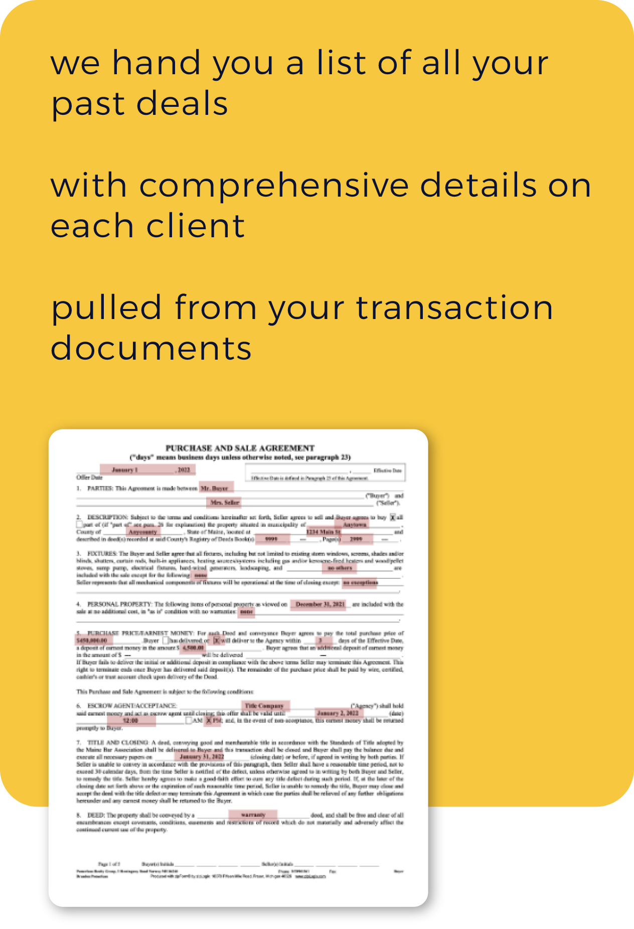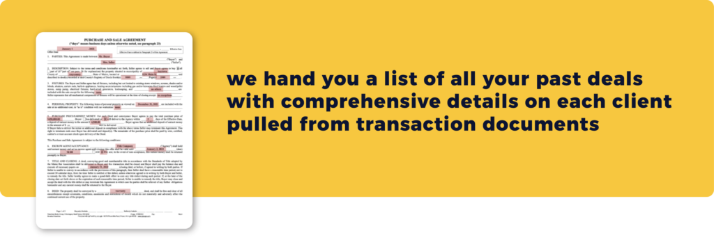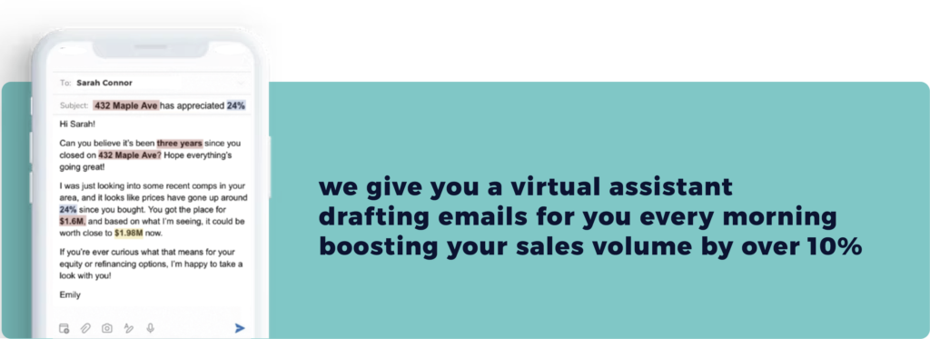 We give each of your agents a personalized assistant that writes thoughtful, one-to-one follow-up messages using data from each transaction—reviving old client lists and significantly boosting referrals. Meaning we can both feed data to your CRM, or give you an out-of-the-box solution if you do not have one.