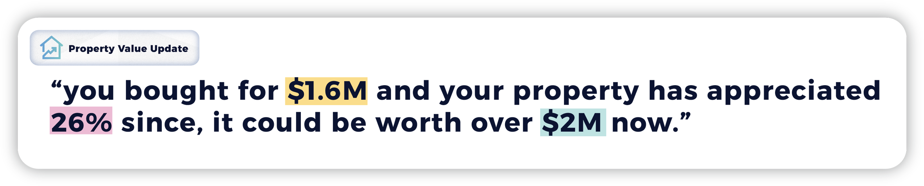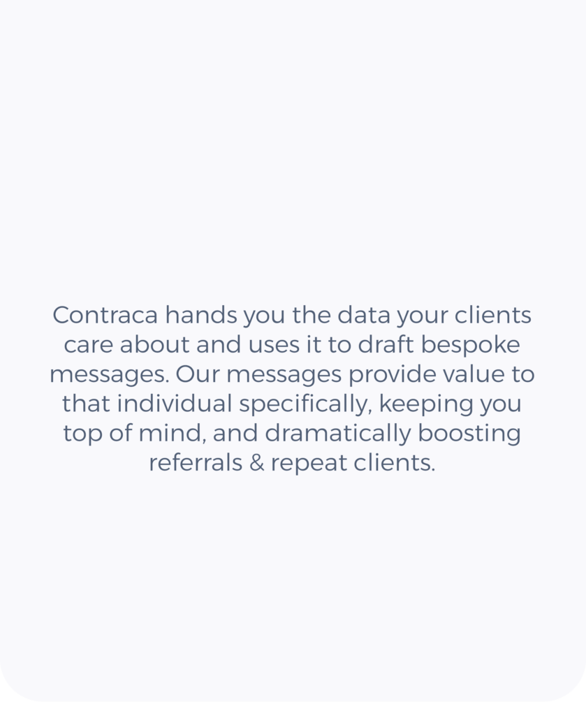 Your clients only care about what is relevant to them– how much their home has increased in value, how much they could save with a refinance, or bigger properties they are looking at when they are expecting a child. Doing this research by hand would take hours, your Contraca virtual assistant takes care of it for you and drafts emails in your inbox every morning.
