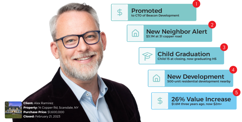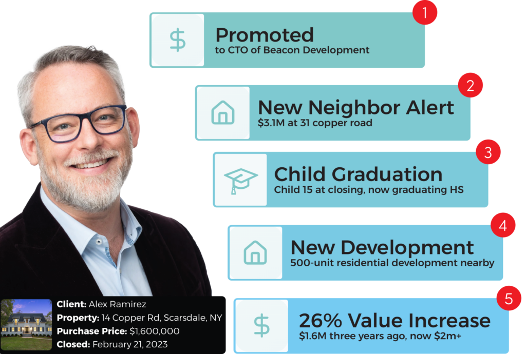 Your clients only care about what is relevant to them– how much their home has increased in value, how much they could save with a refinance, or bigger properties they are looking at when they are expecting a child. Doing this research by hand would take hours, your Contraca virtual assistant takes care of it for you and drafts emails in your inbox every morning.